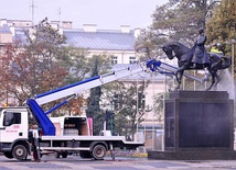 Marszałek wziął prysznic kilka minut po 8 rano, przy pomocy specjalnych służb i wysięgnika. Tradycyjnie pomnik Marszałka Józefa Piłsudskiego na placu Litewskim w Lublinie jest myty przed kolejną rocznicą odzyskania przez Polskę niepodległości.